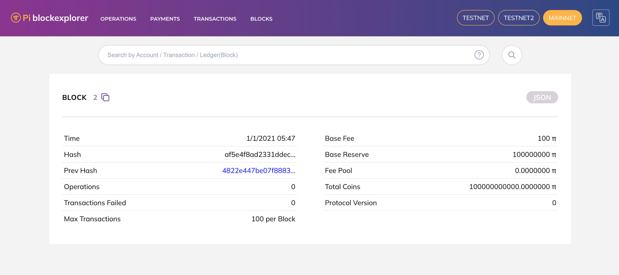 Giao diện sổ cái Pi Network và khối số #2 (ngày 01/01/2021)